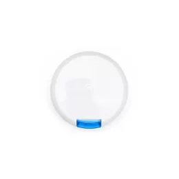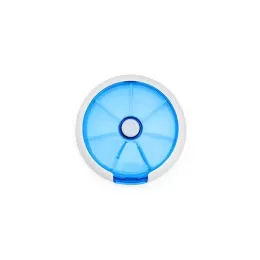 Descrição: Um porta-comprimidos em plástico com design compacto. Possui sete divisórias e um botão de acionamento que gira um compartimento a cada clique, permitindo o acesso ao conteúdo por meio de uma abertura lateral.
