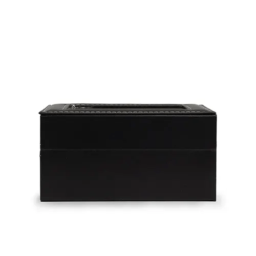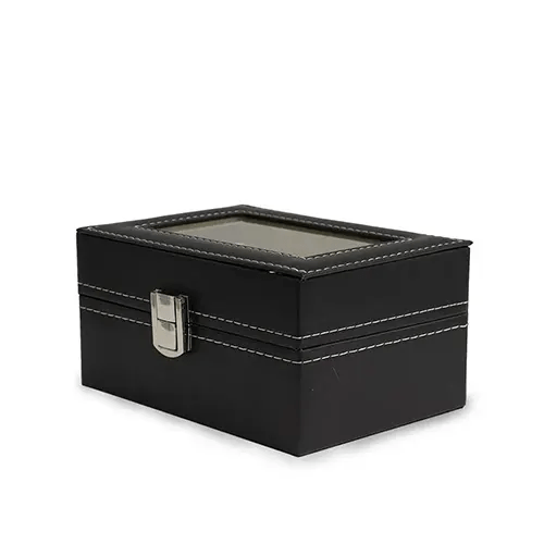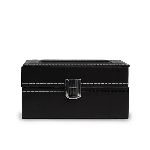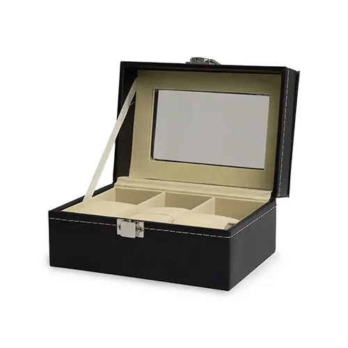 Porta relógios em couro sintético com revestimento aveludado. Possui três divisórias com almofadas para relógios, visor em acrílico e fechadura com trava.
