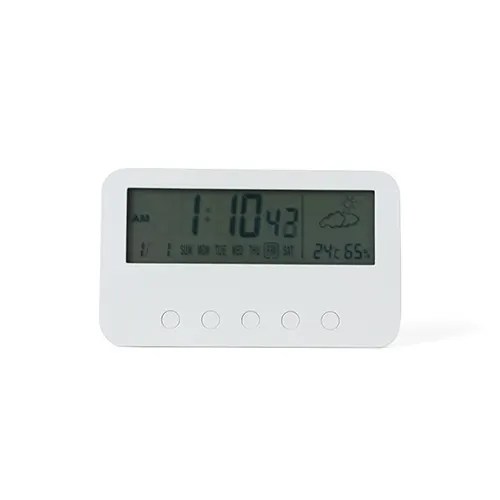 Descrição: Relógio digital com alarme. Produzido em plástico, o relógio possui um display LCD com exibição das horas, dias da semana, data, alarme, relógio de contagem progressiva e regressiva, temperatura, clima e umidade, parte frontal inferior com botões para ajustes, e parte traseira com compartimento para 2 pilhas AAA (não acompanha). Acompanha manual de instruções em inglês