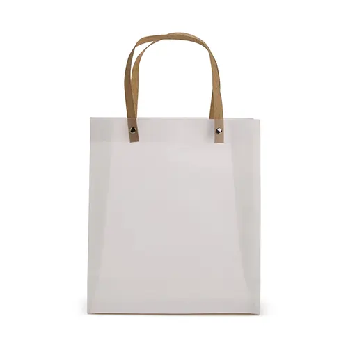 Descrição: Sacola plástica com acabamento fosco e alças em papelão fixadas por botões metálicos.