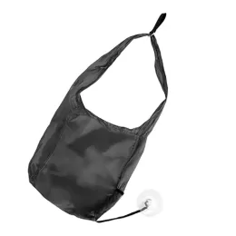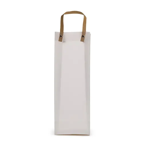 Descrição: Sacola plástica com formato retangular, acabamento fosco e alças em papelão fixadas por botões metálicos.