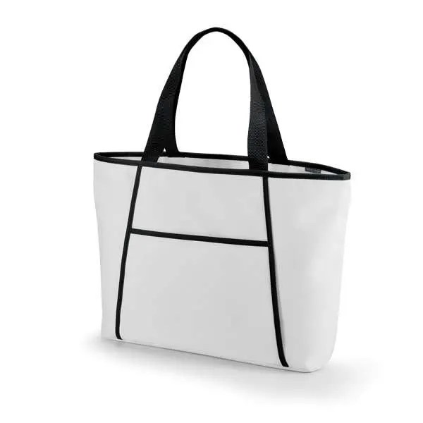 600D. Fecha com zíper. Compartimento exterior aberto (forrado) com bolso frontal. Alças em webbing de 55 cm. Food grade. 470 x 305 x 120 mm