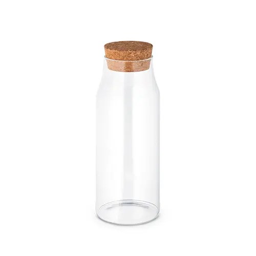 Squeeze em vidro borosilicato com tampa de cortiça. Capacidade até 1L. Food grade. Fornecido em caixa presente de papel craft. ø83 x 215 mm