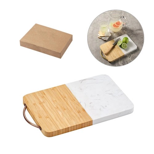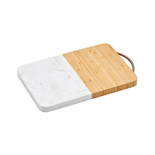 Tábua de corte em bambu e mármore em formato retangular. Contém pega metálica que facilita transporte e arrumação. Fornecido em caixa presente em papel kraft reciclado. Certificação EU Food Grade. A cor e o resultado da impressão nos materiais naturais pode variar entre produtos. 300 x 200 x 20 mm (sem pega)